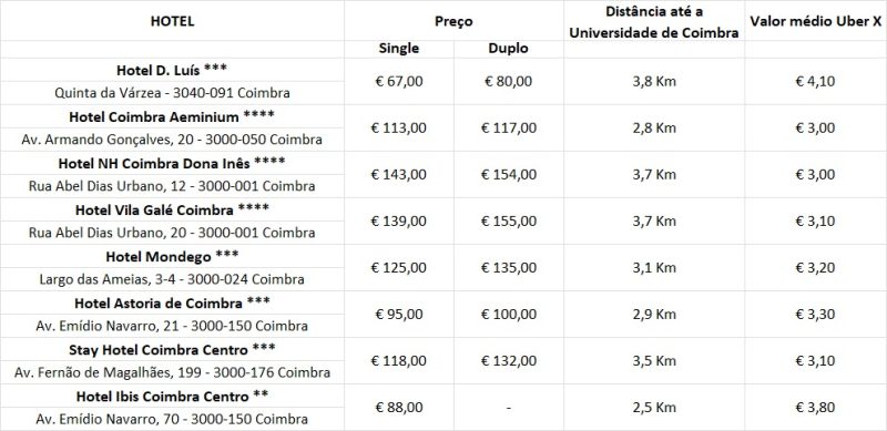 A organização do evento indicou opções de hotéis próximos à Universidade de Coimbra, com reservas centralizadas pela agência Essenci Travel.